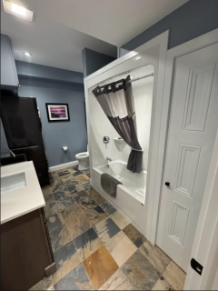 Enjoy a fancy inside tiled shower with body sprayers and rain sprayer with lights and music. 160 gallons or 650 L of hot water from solar!